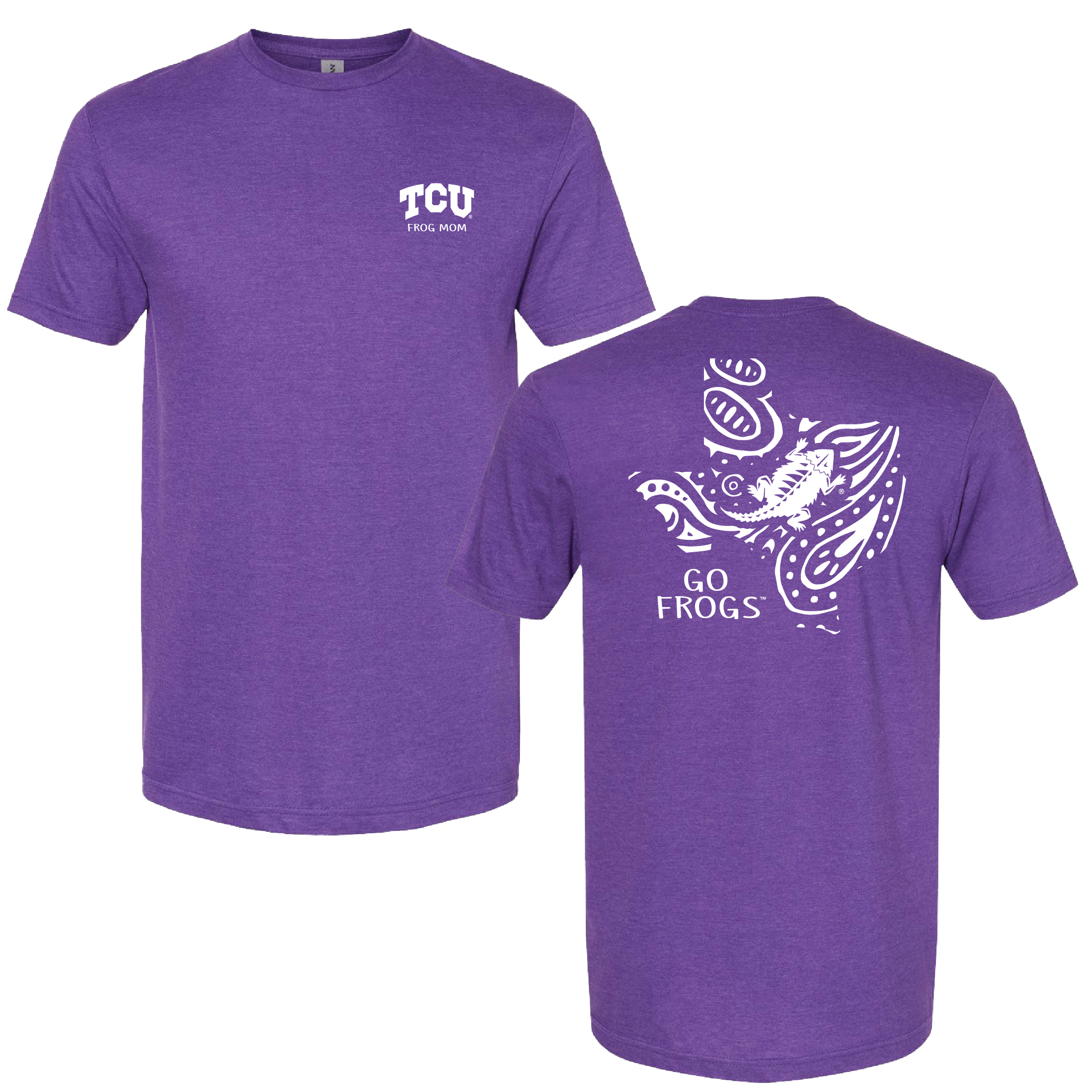 This TCU purple unisex t-shirt is made of 100 percent cotton. The shirt features a white and gray design on the front left chest and the back. Available in Youth S-L.